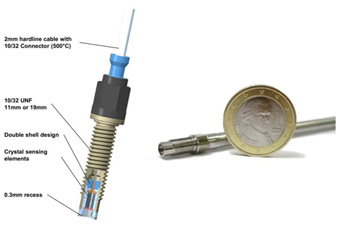 Рисунок 4. Мініатюрний високотемпературний датчик тиску (серія Piezocryst CP5x1) з діаметром приблизно 5 мм (різьба M5 або 10–32 UNF).