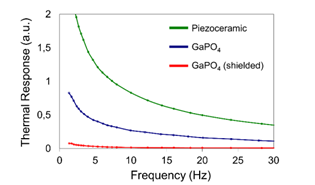 Рисунок 3. Сигнал, спричинений впливом променистого тепла, для різних датчиків тиску на основі монокристалічного фосфату галію (GaPO₄) та п’єзокераміки (зелений). Датчик на основі GaPO₄ (синій) демонструє суттєво нижчу реакцію на теплові градієнти (меншу термічну перехресну чутливість), яку можна додатково знизити шляхом застосування теплозахисного екрана (червона крива).