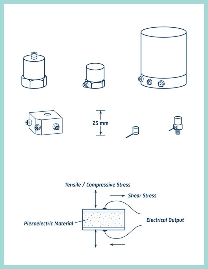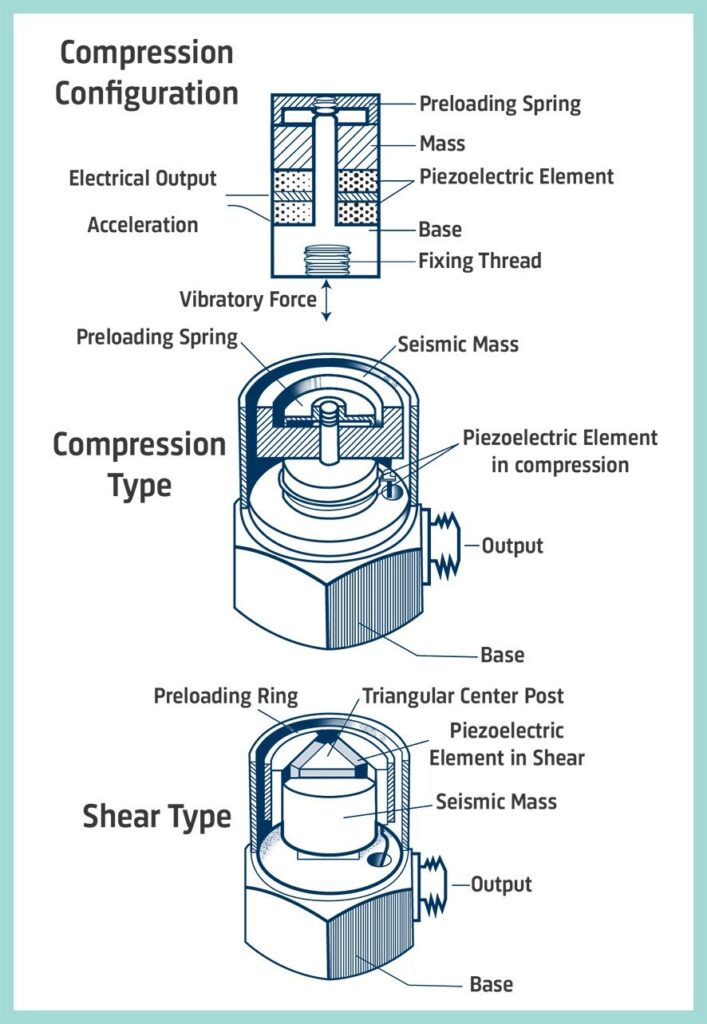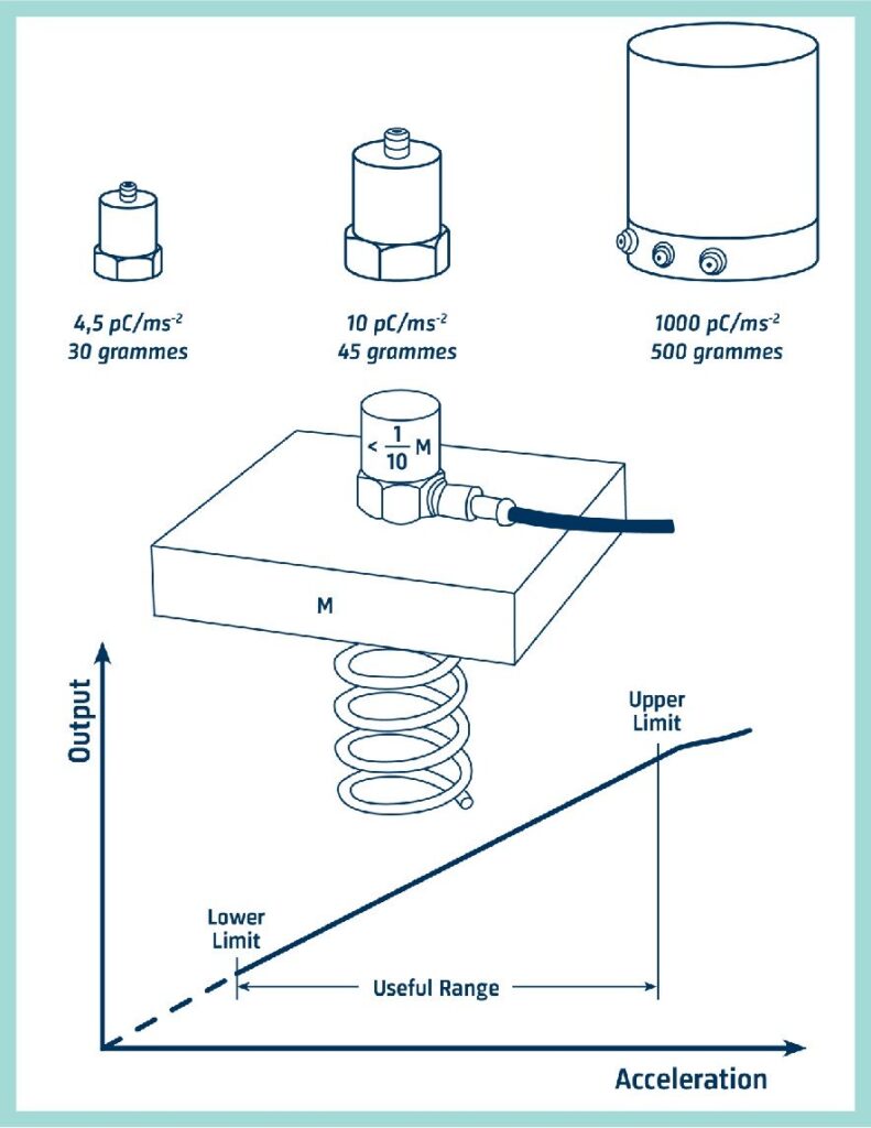 На практиці конструкція п’єзоелектричних елементів акселерометрів влаштована так, що під час вібрації маса прикладає до п’єзоелектричного елемента силу, пропорційну вібраційному прискоренню. Це видно із закону Сила = Маса х Прискорення.