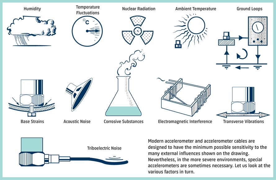 Шум від електромагнітних завад індукується в кабелі акселерометра, коли він перебуває поблизу працюючого обладнання. У цьому відношенні допомагає кабель із подвійним екраном, але у важких випадках слід використовувати збалансований акселерометр і диференціальний підсилювач попереднього підсилення.
