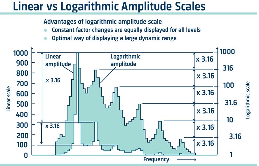 Ми часто наносимо частоту в логарифмічному масштабі. Це приводить до розширення нижніх частот і стиснення високих частот на діаграмі або екрані, таким чином забезпечуючи однакове відсоткове розділення по всій ширині діаграми або екрана і зберігаючи його розмір у розумних пропорціях.