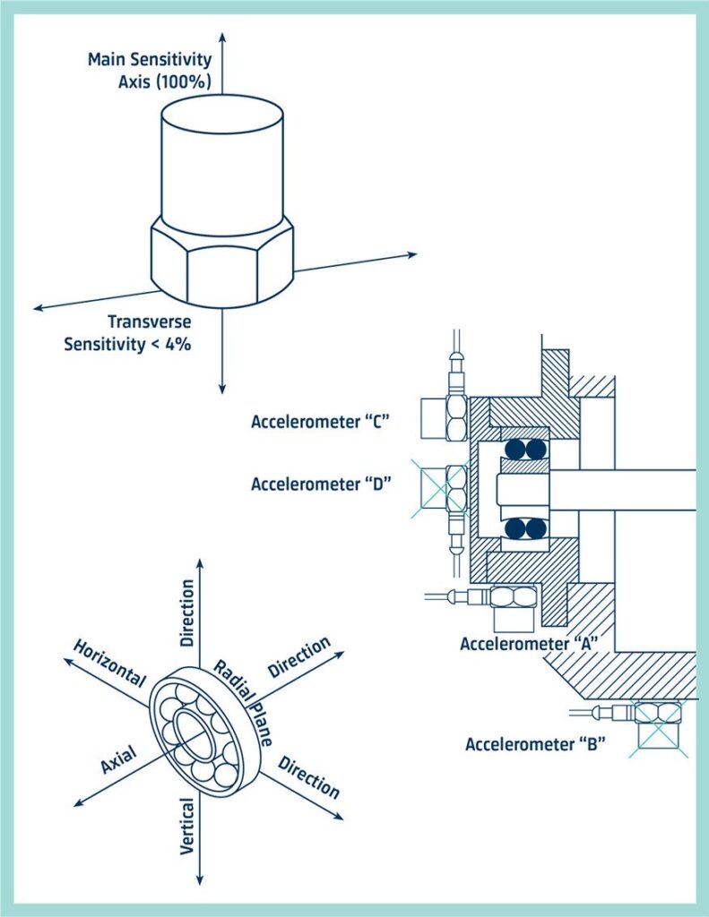 Таким чином, акселерометр «A» виявляє вібраційний сигнал від підшипника, що переважає над вібраціями від інших частин машини, а акселерометр «B» виявляє вібрацію підшипника, імовірно змінену передачею через шарнір, змішану із сигналами від інших частин машини. Так само акселерометр «C» розташований на більш прямому шляху, ніж акселерометр «D».