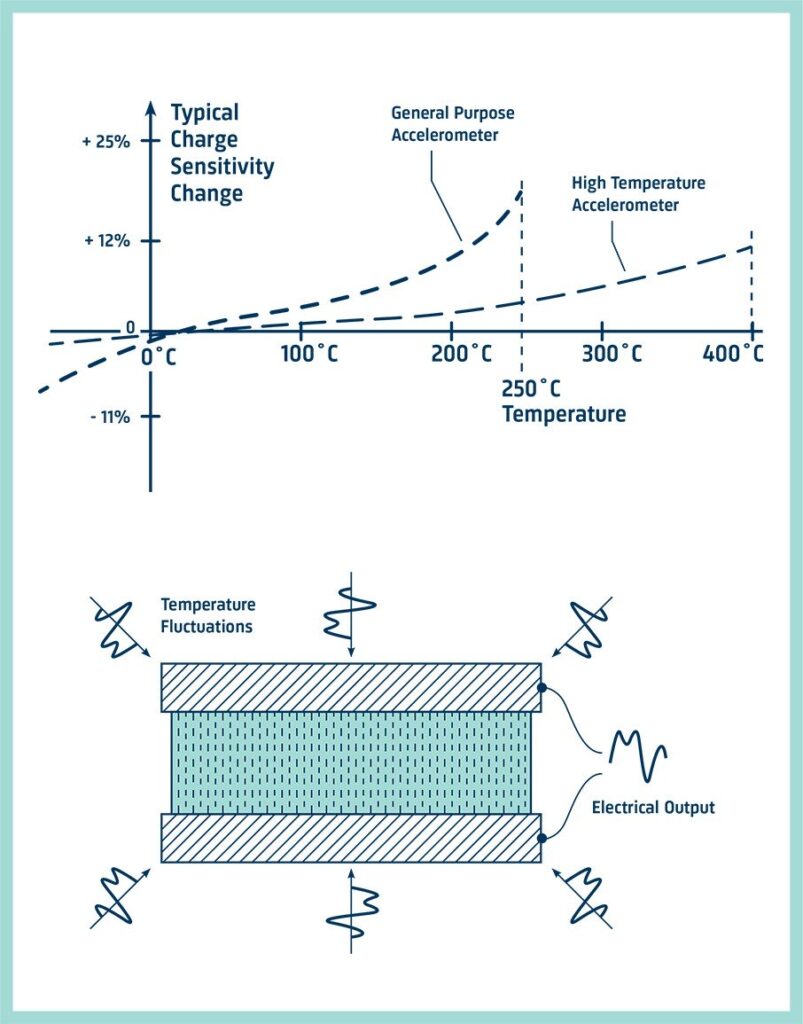 Типові акселерометри загального призначення можуть витримувати температури приблизно до 250°C. За вищих температур п’єзоелектрична кераміка почне деполяризуватися, тож чутливість зміниться назавжди. Якщо деполяризація не надто сильна, такий акселерометр можна використовувати після повторного калібрування. Для температур від -196°C до 482°C доступні акселерометри зі спеціальними п’єзоелектричними матеріалами.