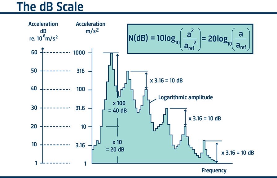 Логарифмічні шкали також використовуються для побудови амплітуд коливань; це дає змогу використовувати шкалу децибел під час порівняння рівнів. Децибел (дБ) являє собою відношення одного рівня до іншого і тому не має розмірів. Але щоб указати абсолютні рівні вібрації, необхідно вказати опорний рівень.