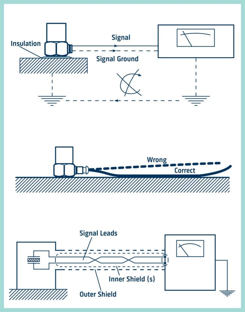 Оскільки акселерометр і вимірювальне обладнання заземлені окремо, в екранах кабелів акселерометрів інколи протікають струми. Контур заземлення можна розірвати, електрично ізолювавши основу акселерометра від монтажної поверхні за допомогою ізолювальної шпильки та слюдяної шайби або ізолювальних адаптерів. У сучасних приладах можна використовувати так звані плаваючі входи, якщо напруги не надто високі.