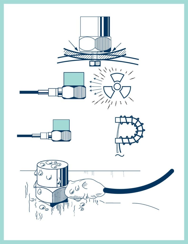 Акселерометри B&K герметизовані або епоксидною смолою, або зварюванням для забезпечення надійної роботи у вологому середовищі. Для короткочасного використання в рідинах або там, де можлива сильна конденсація, рекомендується використовувати кабелі акселерометра з тефлоновим ущільненням. Роз’єм акселерометра також має бути герметизований безкислотним силіконовим каучуком або мастикою, що вулканізується за кімнатної температури. Промислові акселерометри з вбудованими кабелями слід використовувати для постійного використання у вологих або вологих приміщеннях.