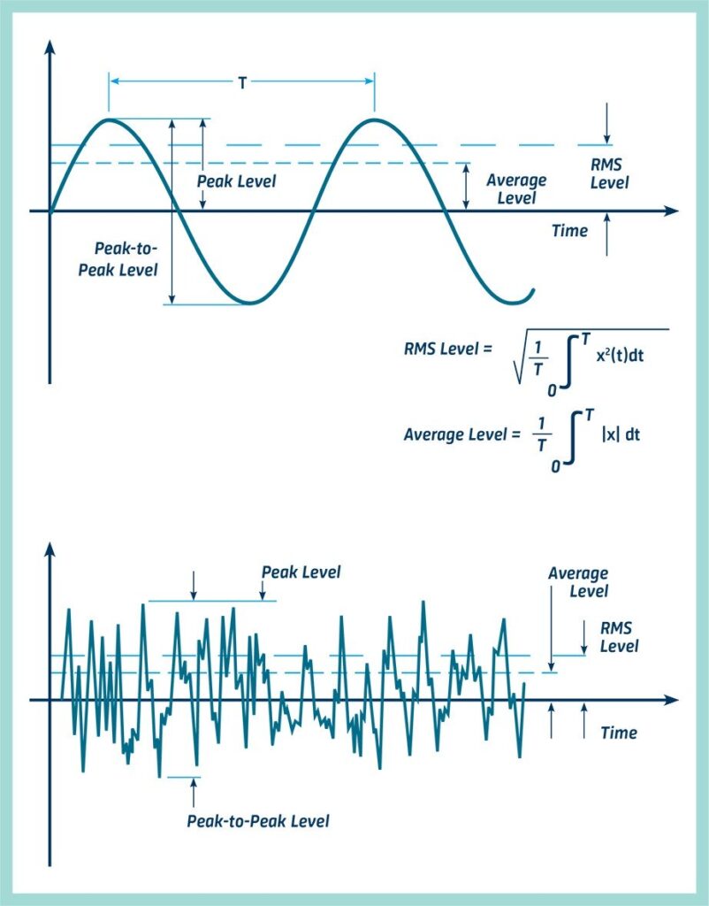 Амплітуда вібрації, яка є характеристикою, що описує серйозність вібрації, може бути кількісно визначена кількома способами. На діаграмі показано співвідношення між розмахом, піковим рівнем, середнім рівнем і середньоквадратичним рівнем синусоїди.