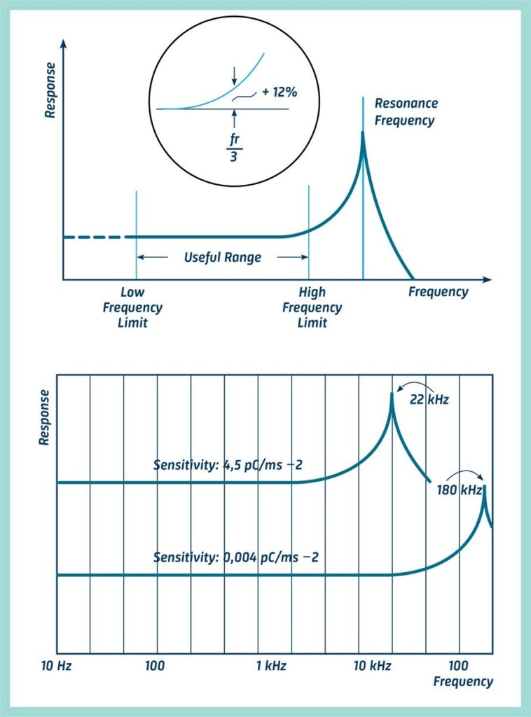 Механічні системи, як правило, мають більшу частину своєї енергії вібрації, що міститься у відносно вузькому діапазоні частот від 10 Гц до 1000 Гц, але вимірювання часто виконуються, скажімо, до 10 кГц, тому що на цих вищих частотах часто присутні цікаві компоненти вібрації. Тому під час вибору акселерометра ми повинні переконатися, що діапазон частот датчика може охоплювати цікавий для нас діапазон частот.