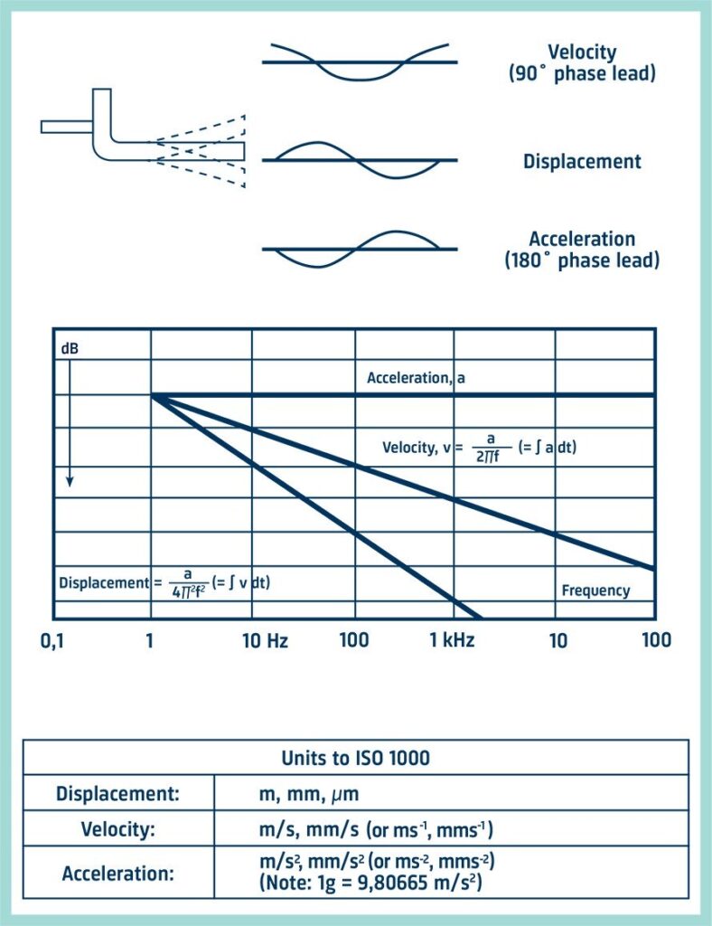 Для синусоїдальних сигналів амплітуди переміщення, швидкості та прискорення математично пов’язані функцією частоти і часу, це показано графічно на діаграмі. Якщо знехтувати фазою, як це завжди буває під час проведення середньочасових вимірювань, то рівень швидкості можна отримати, поділивши сигнал прискорення на коефіцієнт, пропорційний частоті, а переміщення можна отримати, поділивши сигнал прискорення на коефіцієнт, пропорційний квадрату частоти. Це ділення виконується цифровим способом у вимірювальній апаратурі.