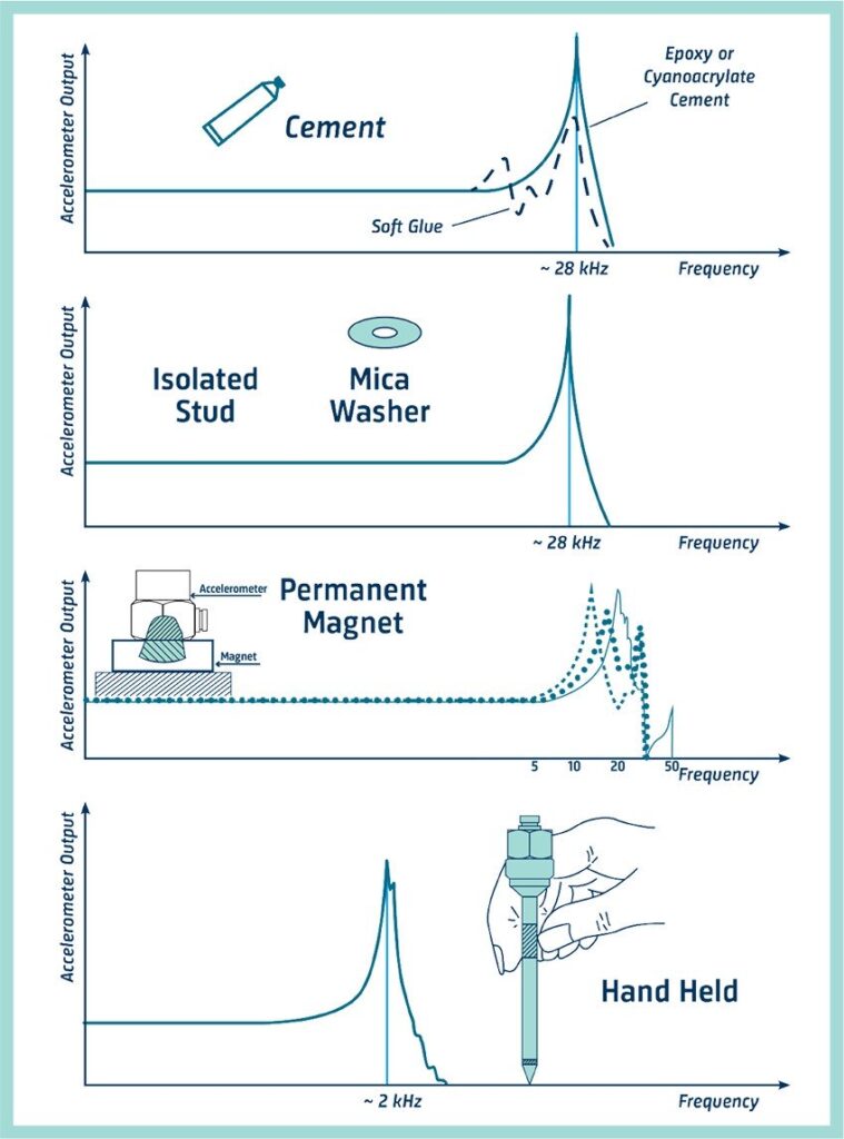 Спосіб кріплення акселерометра до точки вимірювання є одним із найважливіших факторів для отримання точних результатів практичних вимірювань вібрації. Неакуратний монтаж призводить до зниження встановленої резонансної частоти, що може сильно обмежити корисний частотний діапазон акселерометра.