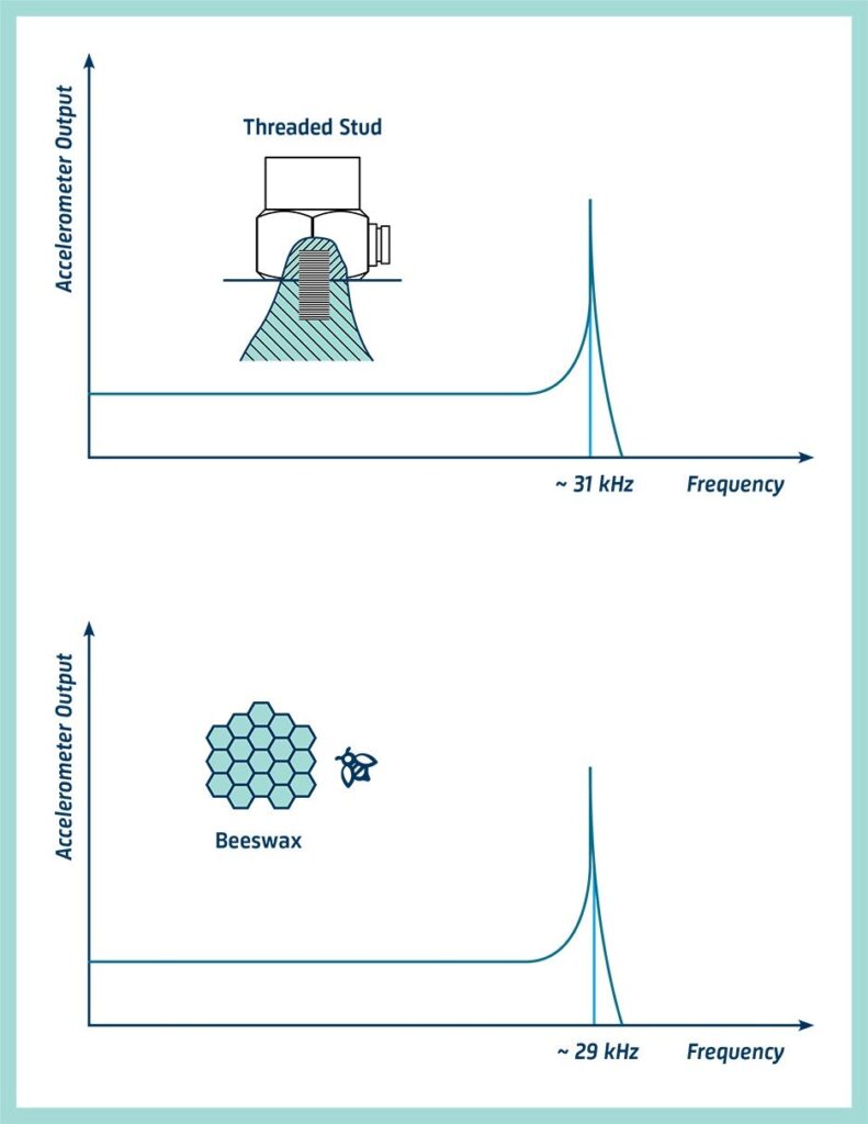 Зазвичай використовуваний альтернативний метод кріплення — це використання тонкого шару бджолиного воску для приклеювання акселерометра на місце. Не забудьте стиснути шар воску якомога сильніше, щоб отримати дуже тонкий шар! Як видно з АЧХ, резонансна частота знижена лише незначно (до 29 кГц). Оскільки бджолиний віск стає м’яким за вищих температур, метод обмежений температурою близько 40°C. На чистих поверхнях фіксацію бджолиним воском можна використовувати до рівня прискорення близько 100 м/с 2.