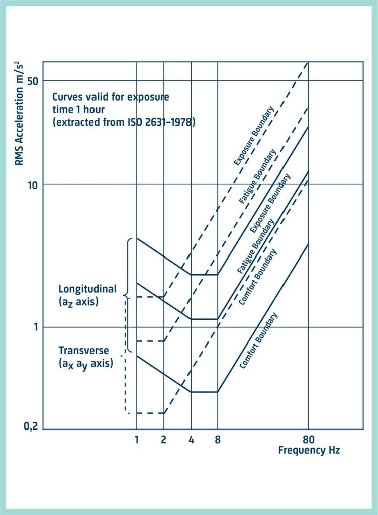 Першою опублікованою міжнародною рекомендацією, що стосується вібрації та людського тіла, є ISO 2631-1978, у якій викладено обмежувальні криві для часу впливу від 1 хвилини до 12 годин у діапазоні частот, у якому людське тіло найбільш чутливе, а саме від 1 Гц до 80 Гц. Більш пізні версії стандарту містять більше деталей.