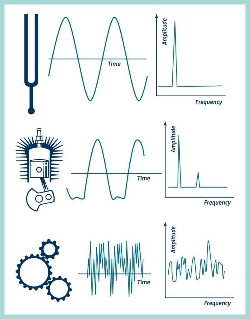 На практиці вібраційні сигнали зазвичай складаються з дуже багатьох частот, що виникають одночасно, тож ми не можемо відразу побачити, просто поглянувши на амплітудно-часову характеристику, скільки компонентів і на яких частотах вони виникають.