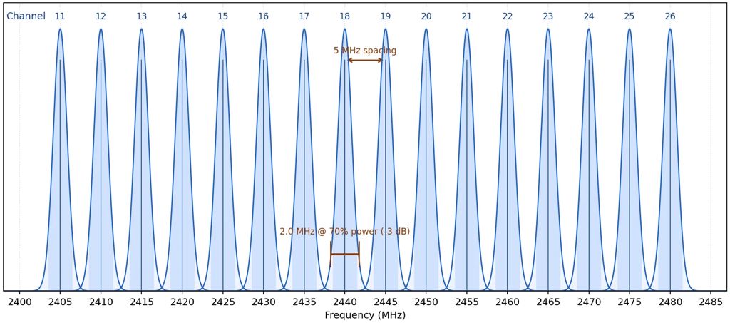 Як показано на графіку вище, стандарт IEEE 802.15.4 розділяє діапазон 2,4 ГГц на 16 каналів, від 11 до 26. Центральні частоти кожного каналу розташовані на відстані 5 МГц одна від одної. Кожен канал має 2 МГц у точці -3 дБ, але, як показує графік, повна смуга пропускання каналу може переходити на сусідні канали, але з дуже низькою потужністю.