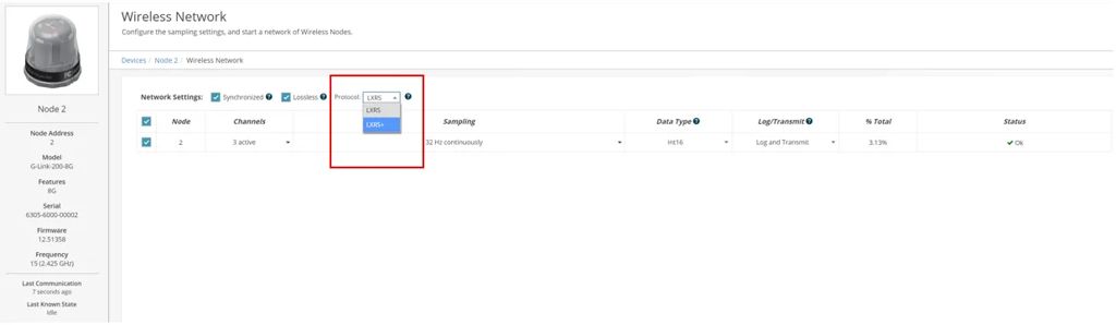 У випадках, коли важливим є діапазон, слід використовувати LXRS. LXRS вмикається за замовчуванням для всіх бездротових вузлів, що постачаються з заводу. Однак перехід між LXRS і LXRS+ є простим. Це можна зробити під час запуску вузла, як показано нижче.