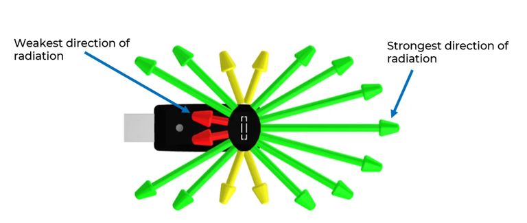 Антени не випромінюють сигнал рівномірно (однаково в усіх напрямках). На графіках у цьому розділі детально показано напрямки, в яких антени випромінюють сигнал найсильніше та найслабше. Діаграми також враховують будь-яке ослаблення сили випромінювання, спричинене самим бездротовим вузлом. Наприклад, метал або батареї на вузлі ослаблюють силу сигналу вздовж цього шляху.