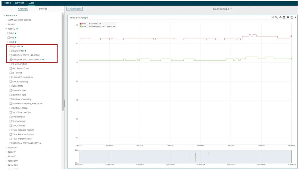 RSSI, або індикатор сили прийнятого сигналу, повідомляє користувачам про силу сигналу, який приймається вузлом або приймачем шлюзу. RSSI надається як частина діагностичного пакета, який періодично надсилається як під час активного збору даних вузлами, так і під час простою. Цей індикатор є чудовим способом визначити, чи проблеми зі зв’язком пов’язані з недостатньою силою сигналу. SensorConnect може відображати RSSI у динаміці.