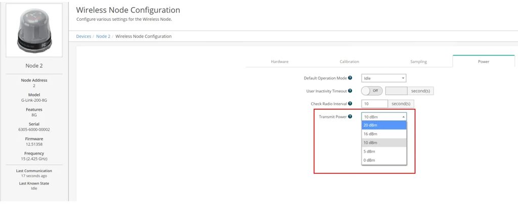 Потужність передачі виражається в дБм. Чим вище число, тим вище потужність передачі. Збільшення потужності передачі може розширити діапазон, в якому вузол може комунікувати з базовою станцією. Базова станція також повинна надсилати команди та часові мітки до вузла, тому обов’язково відрегулюйте її потужність передачі.