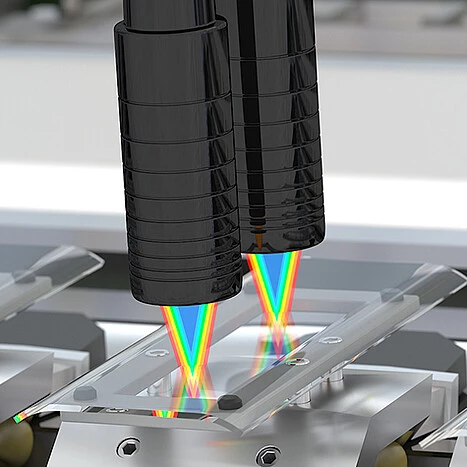 Вимірювання товщини скла лише одним датчиком Малі розміри датчиків для вимірювання в обмеженому просторі Ідеально підходить для вимірювань з високою роздільною здатністю в напівпровідниковій промисловості Високоточні вимірювання відстаней у вимірювальних машинах